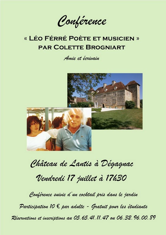 "Léo Ferré en Quercy". Poète et musicien, conférence de Colette Brogniart. Vendredi 17/07/2026.